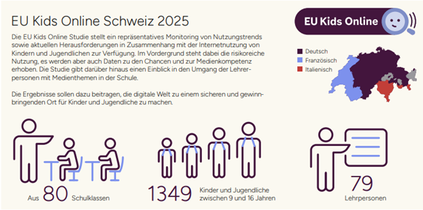 Eine Studie der PH Schwyz vom Frühjahr 2025 untersuchte die Interneterfahrung von 9 bis 16 jährigen Kindern und Jugendlichen mit Fokus auf die risikoreiche Nutzung. Die Ergebnisse zeigen auf, in welchen Bereichen Kinder und Jugendliche Unterstützung benötigen, welche Einstellungen sie gegenüber aktuellen Technologien haben und zu welchen Themen sie sich mehr Hilfe und Tipps wünschen.